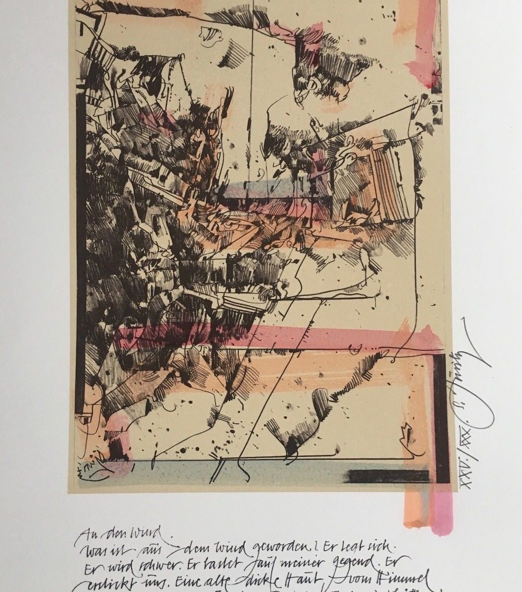 Sechs signierte, nummerierte und kolorierte (teils handkolorierte) Original Lithographien mit je einem Gedicht von Peter Härtling